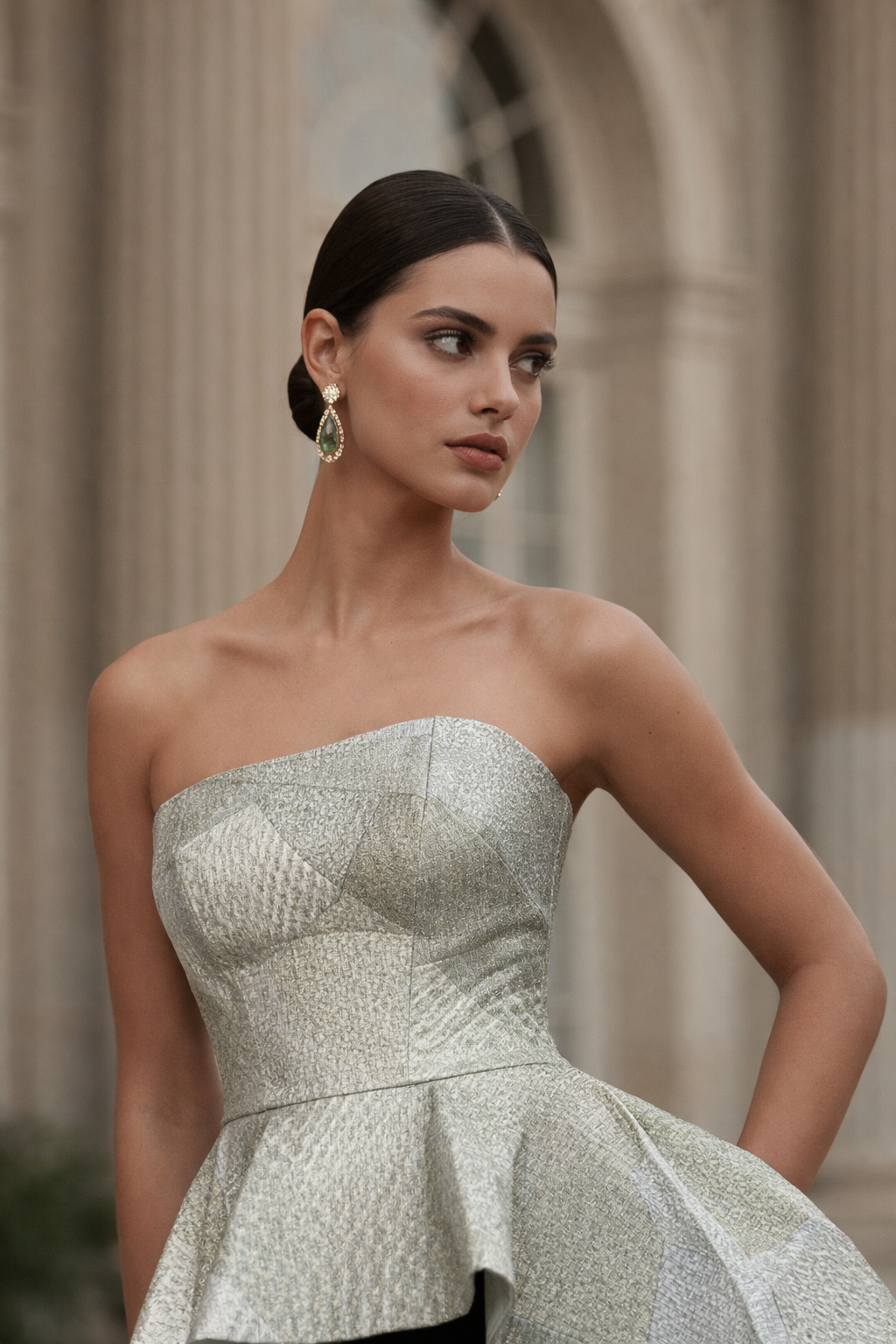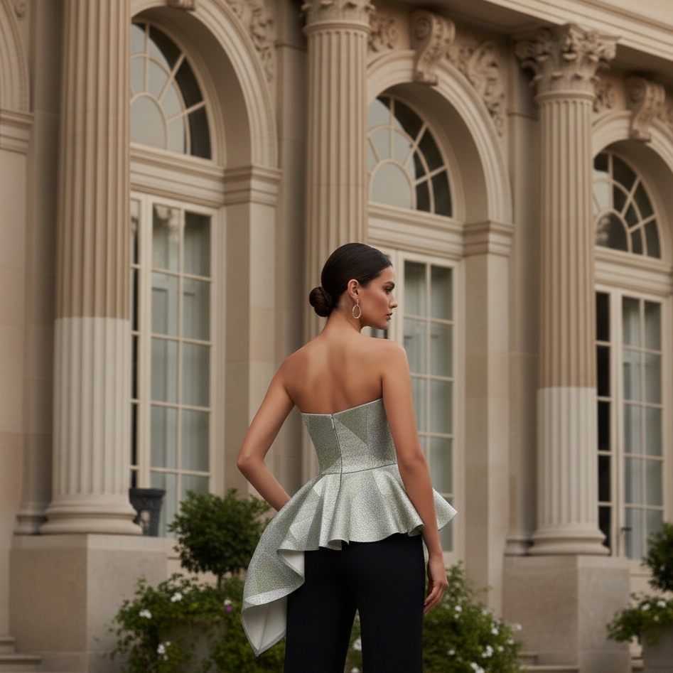 At the waist, the design flares into a dramatic, asymmetrical peplum, with one side extending longer in a sculptural drape.