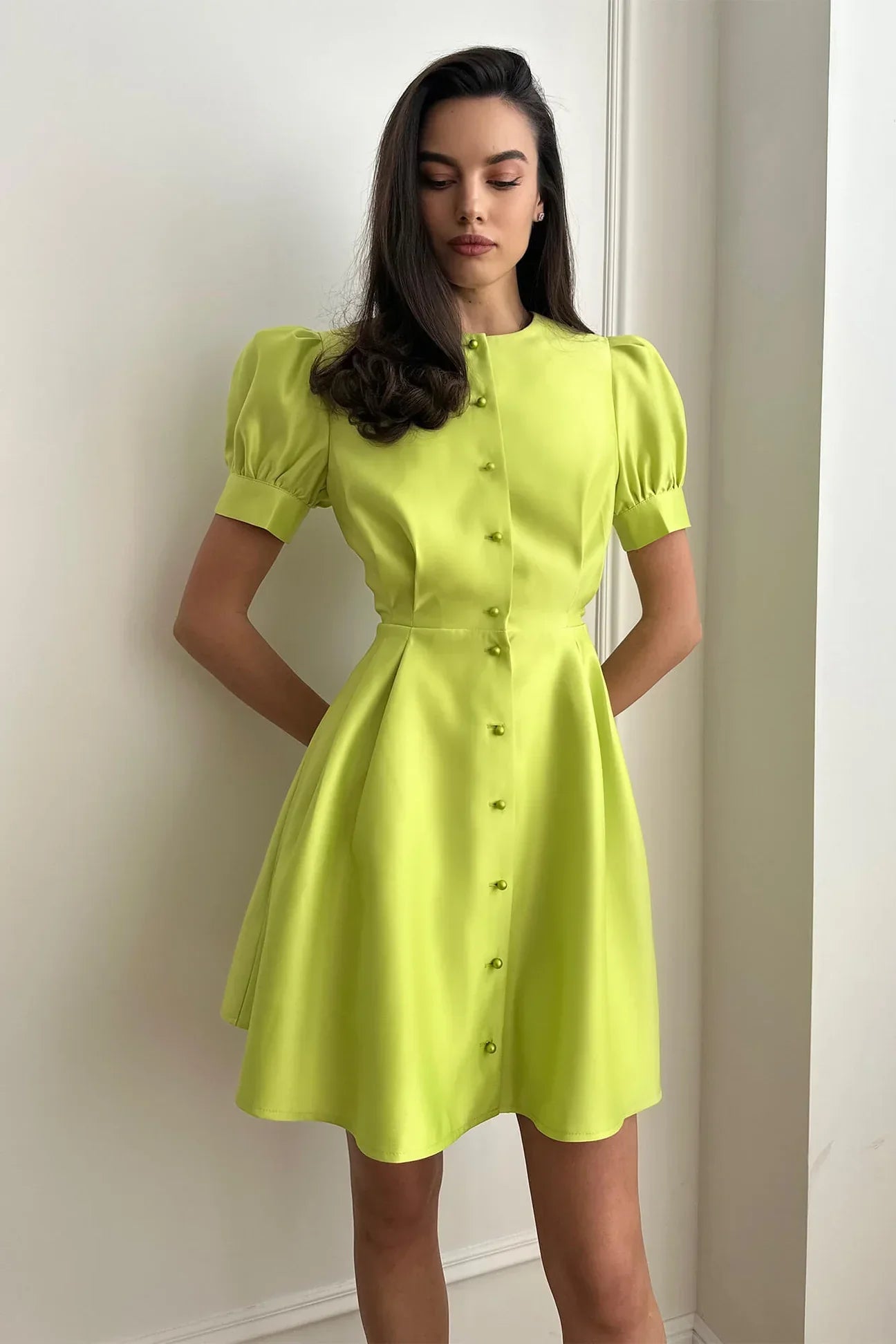 An exquisite mini dress with a fluffy skirt. The material satin in Lime and the lantern sleeves make this dress really sumptuous. The waistline emphasises the silhouette while the fluffy skirt creates lightness. Fastened with buttons.