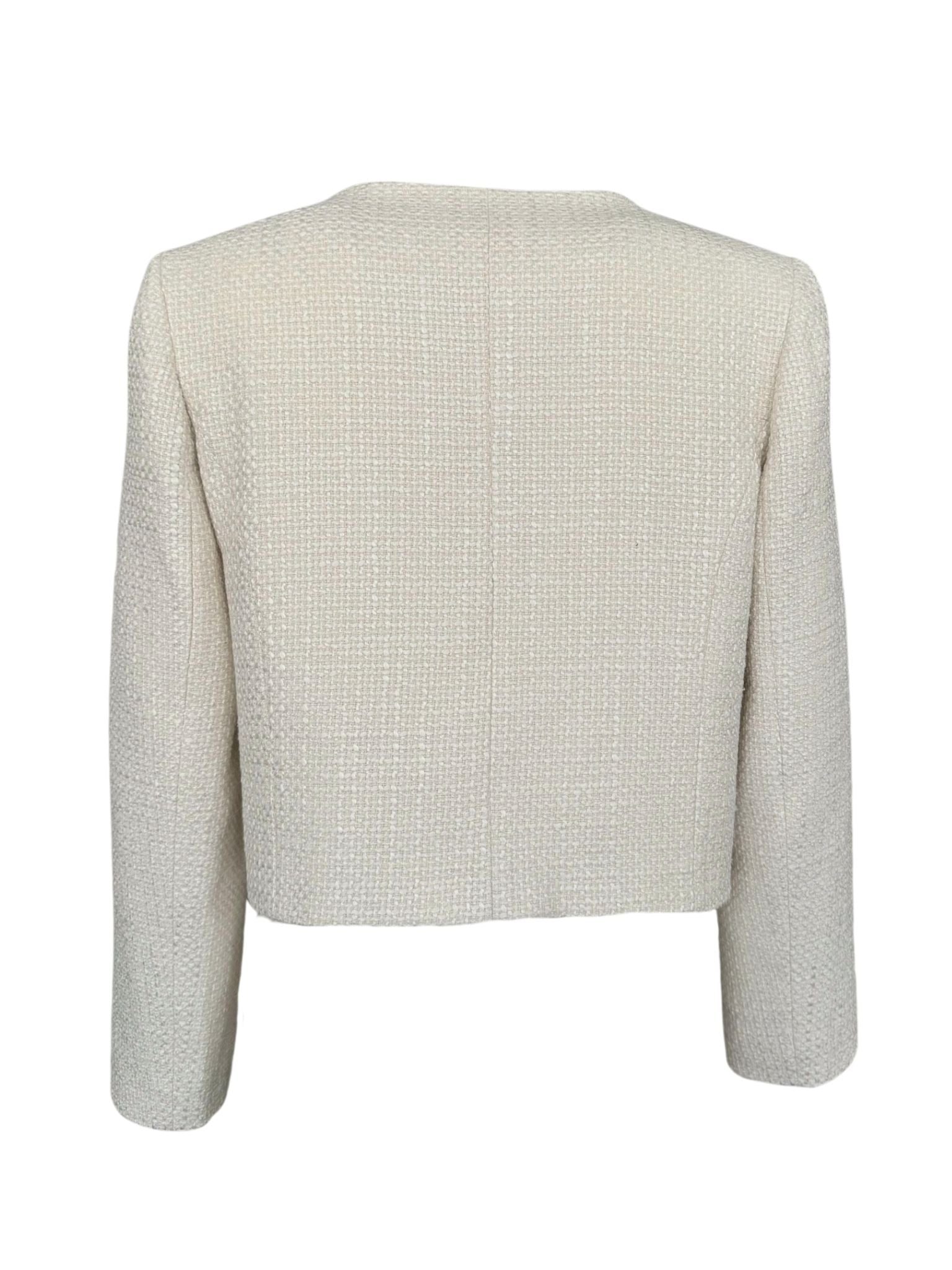 A refined cropped jacket featuring elegant gold-tone buttons and front flap pockets for a timeless touch. Designed with clean lines and a structured silhouette, it embodies understated sophistication. Perfect for formal settings, luncheons, or elegant evenings, this piece pairs effortlessly with tailored trousers, skirts, or dresses for a polished, graceful look.