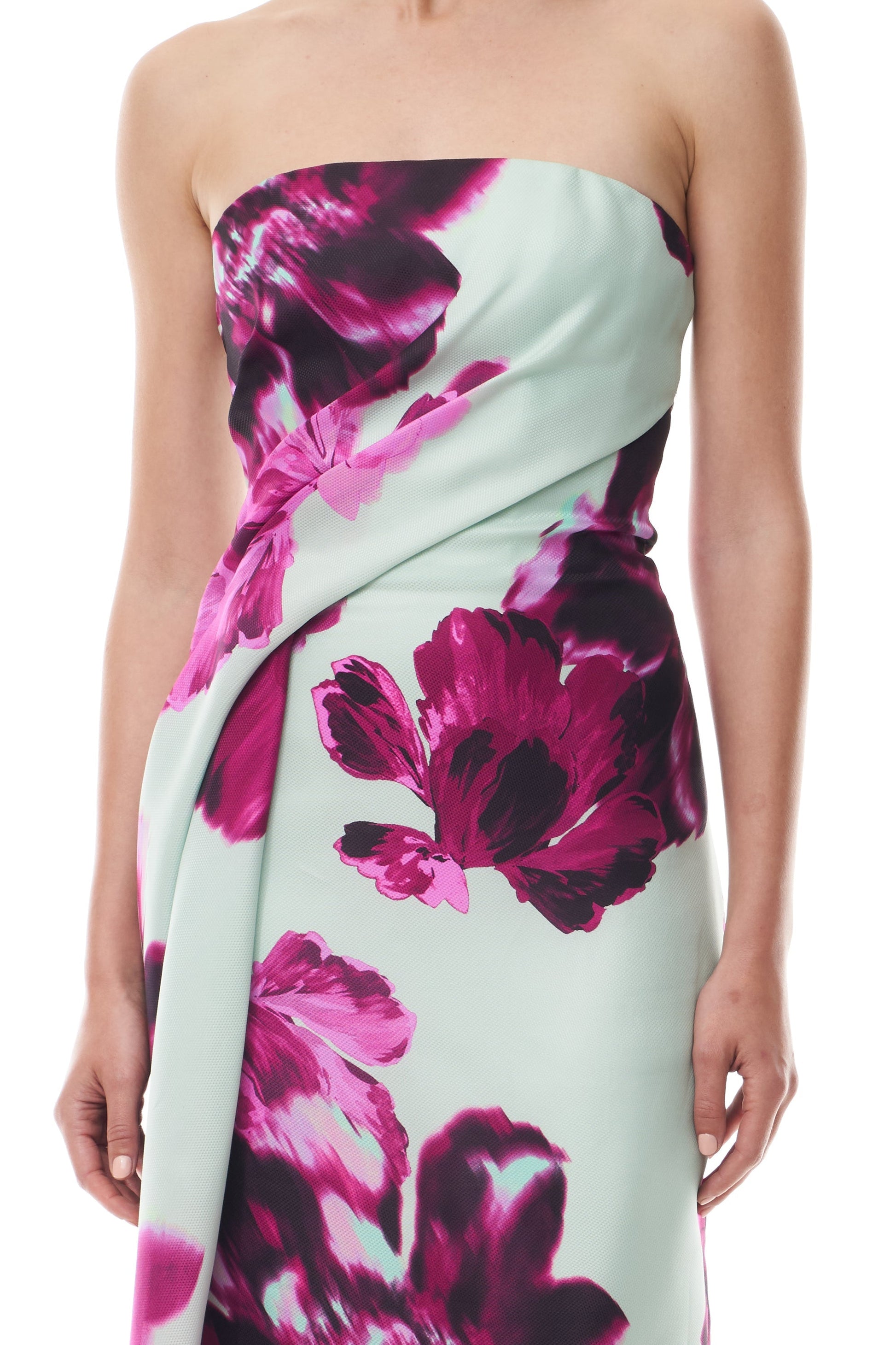 Make an unforgettable entrance in the Electric Bloom Column Gown, where minimalism meets maximal floral impact. This strapless silhouette stuns with its clean lines and dramatic oversized bloom print in vivid shades of fuchsia and magenta. The floor-length design drapes effortlessly over the body, creating a statuesque effect that radiates confidence and modern elegance. Perfect for formal galas, evening receptions, and red-carpet moments.