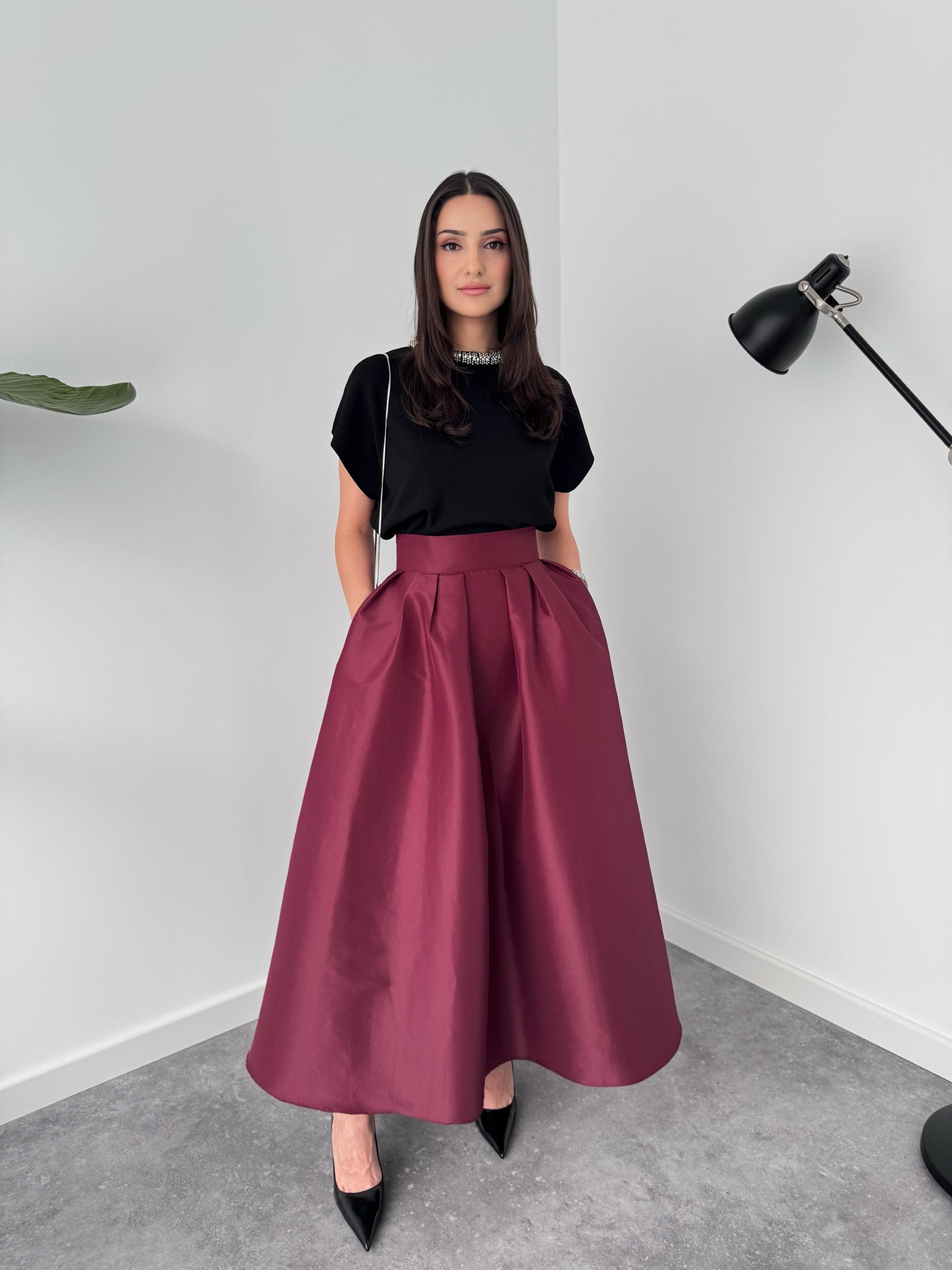 Sculpted to perfection, the Evening Grace Taffeta Skirt brings structured sophistication to any wardrobe. With its voluminous A-line silhouette and crisp pleats, this high-waisted piece adds a refined touch to your ensemble—whether you're heading to a special event or elevating your everyday look.