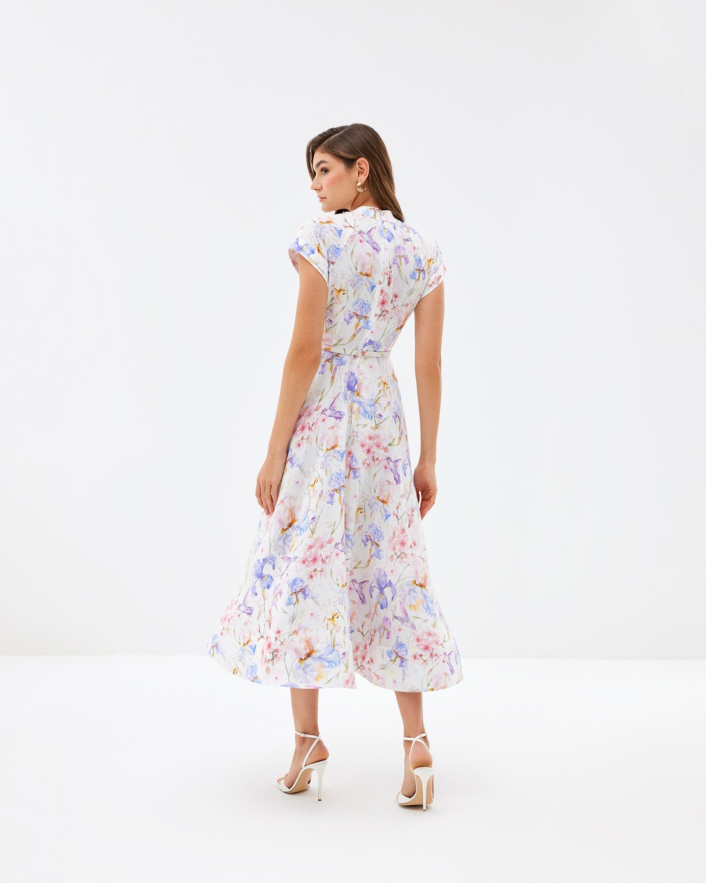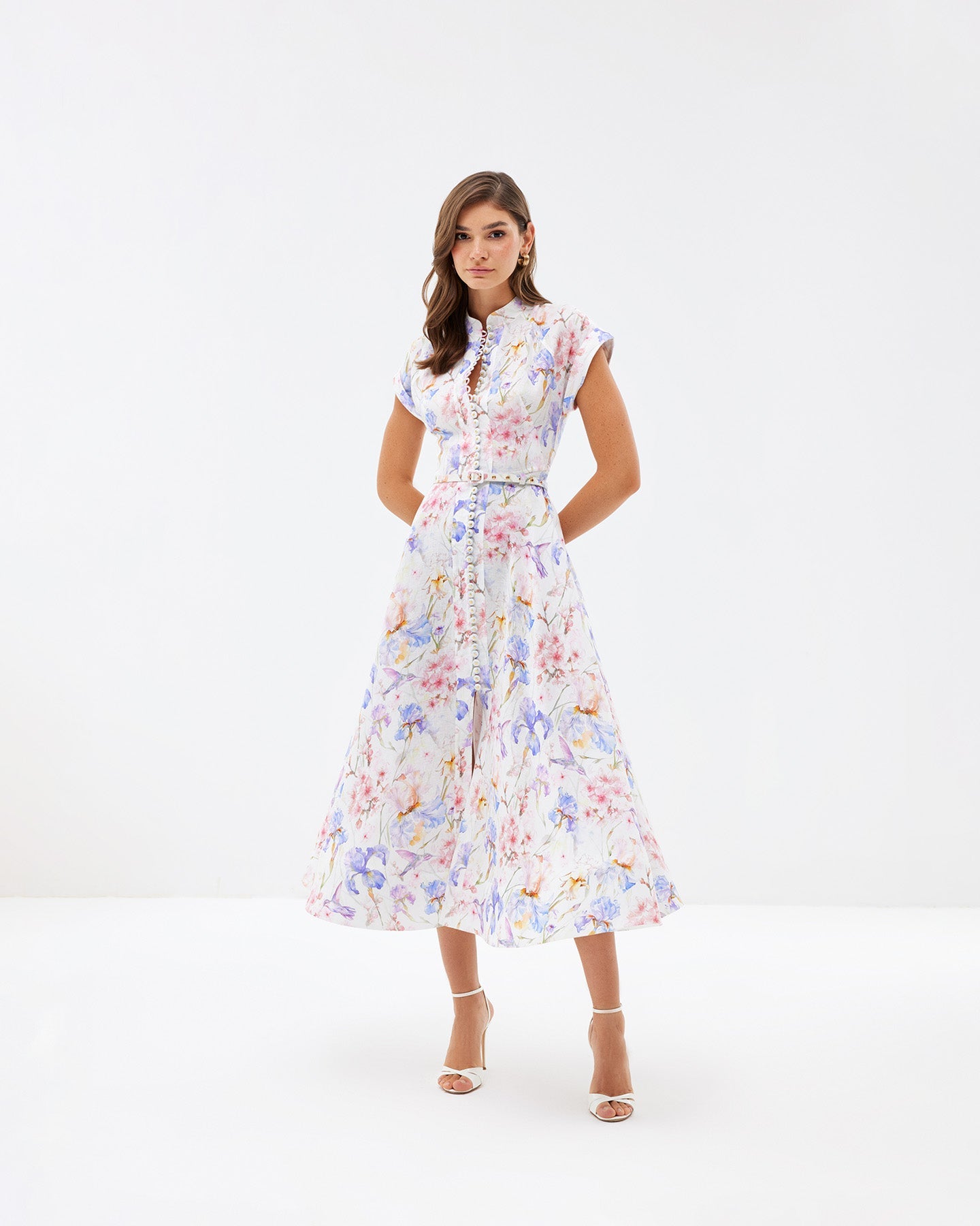 Where elegance meets whimsy — the Fairy Fizz Jasmine Dress is a vision of timeless beauty. This shirt-style midi dress features delicate floral patterns and a flattering belted waist that enhances your silhouette. The mandarin collar and front button detailing lend a touch of sophistication, while the flowing skirt adds graceful movement with every step. Ideal for brunches, garden parties, or any moment that calls for effortless charm.