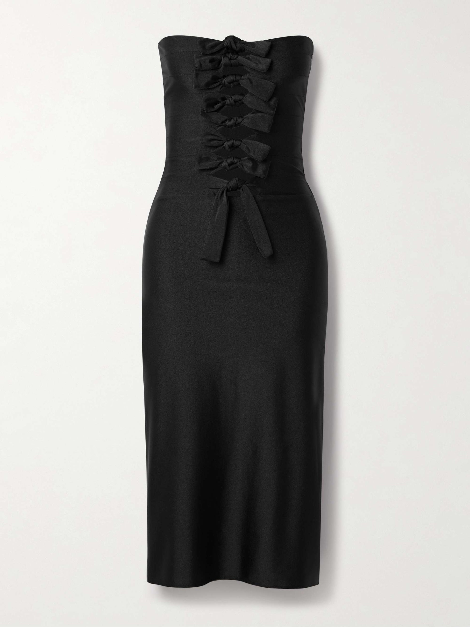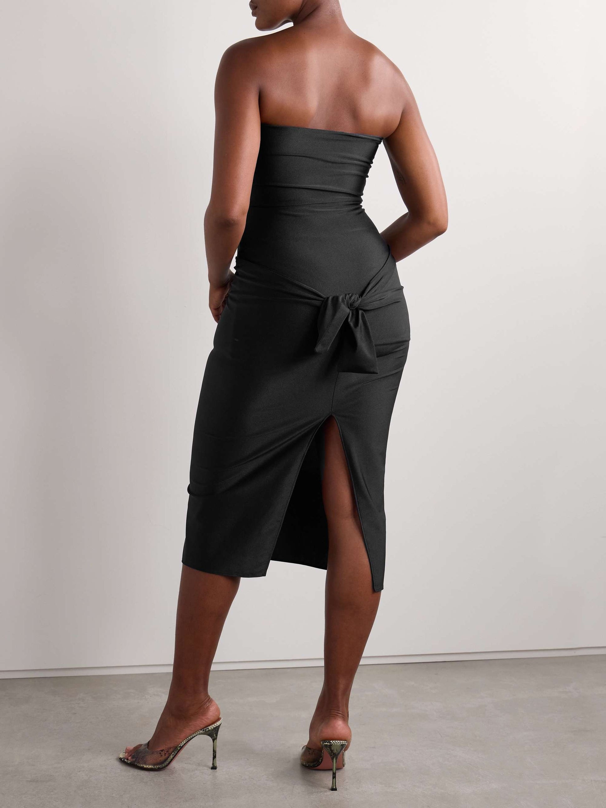 The Knotted Cutout Midi Dress is designed for those who love bold sophistication. Its strapless neckline and knotted strips along the bodice create a striking look while revealing subtle peeks of skin for a touch of allure. Perfect for evening events and upscale parties where confidence is key.