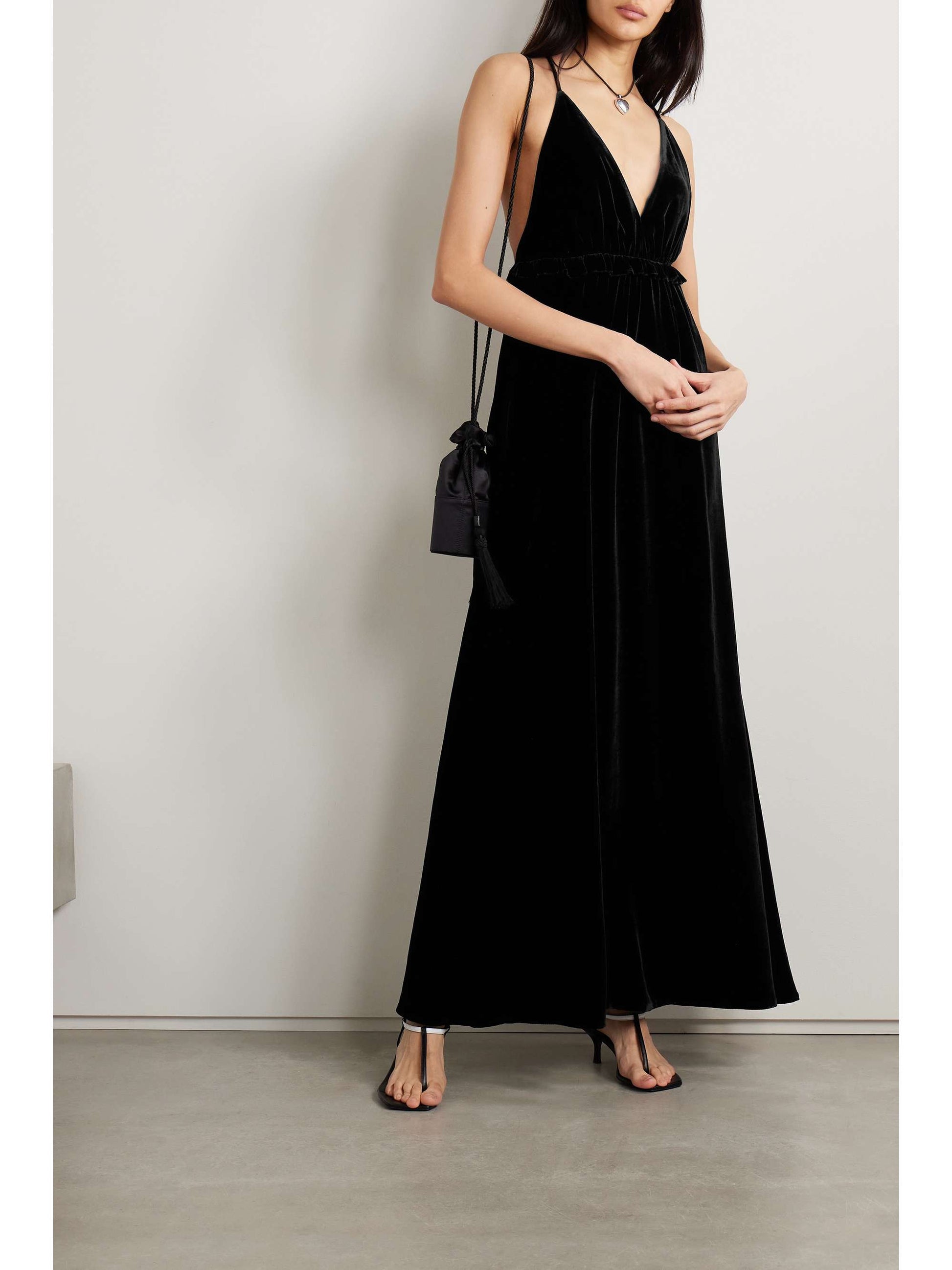 The Lavinia Open-Back Dress is designed to captivate with its fluid grace. Its luxurious fabric moves beautifully with every step, making it perfect for formal evening events where sophistication is key. The plunging V-neckline, paired with delicate slim straps, frames the open back for a striking yet elegant look.