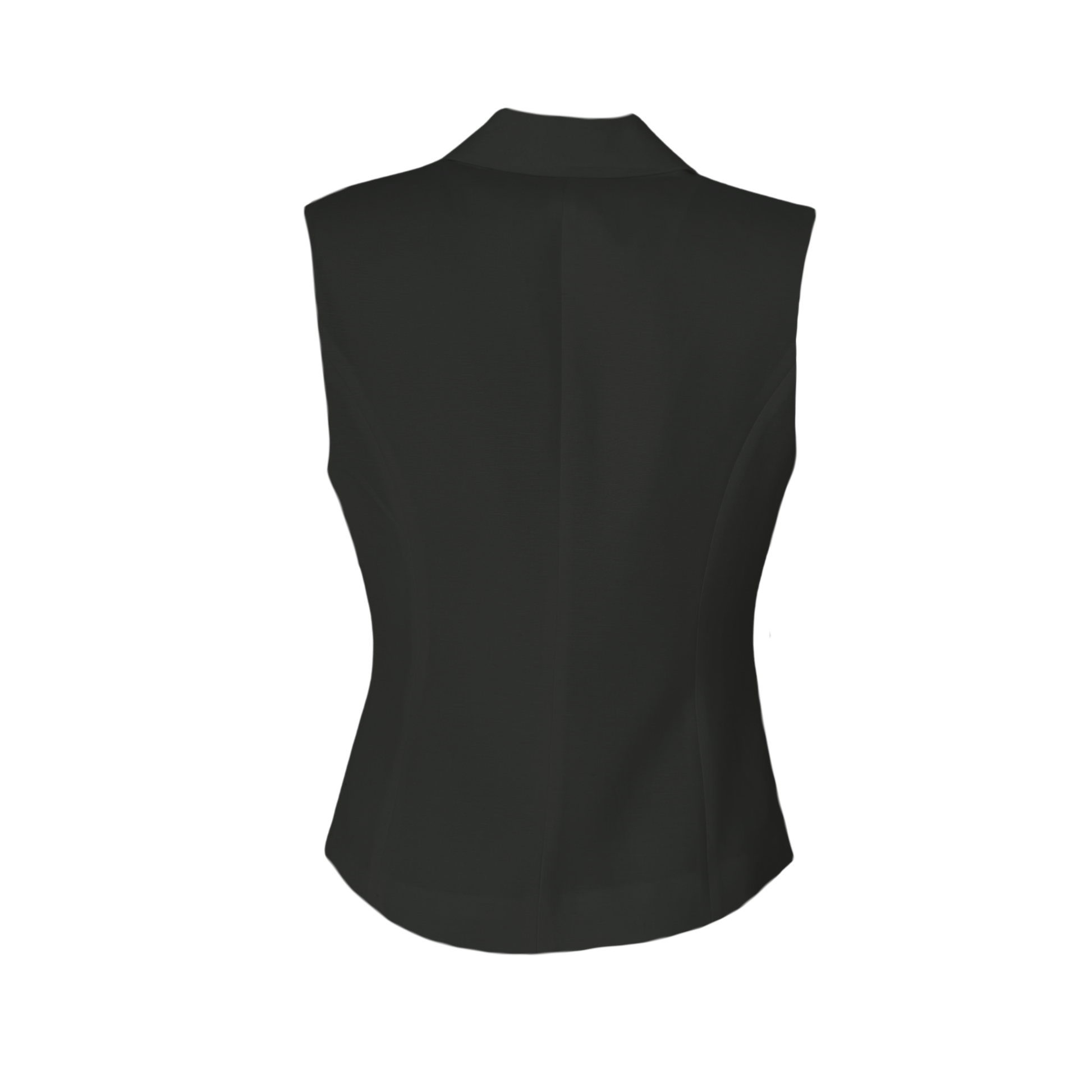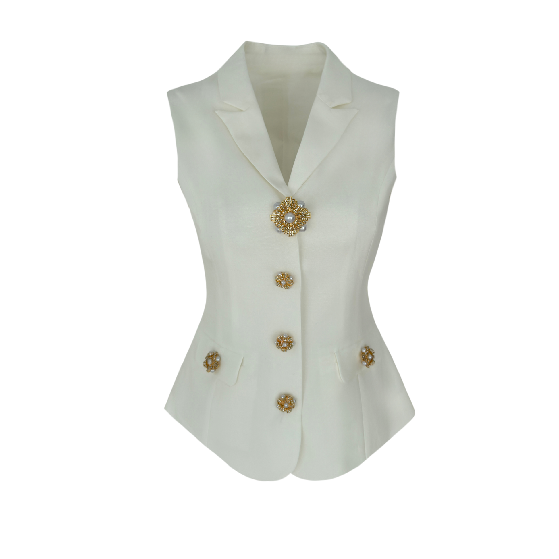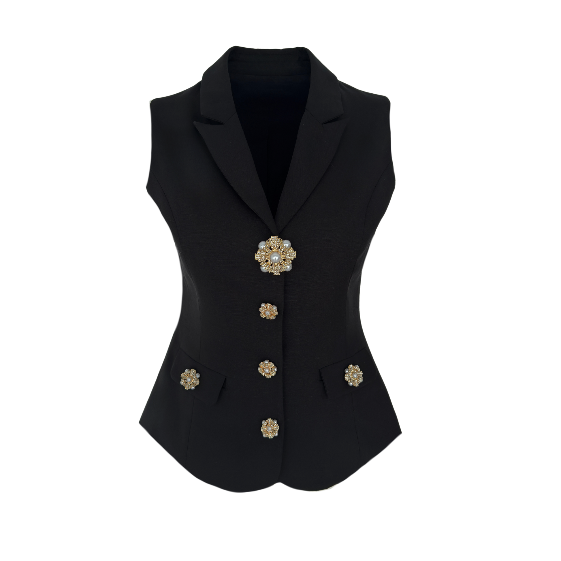 The tailored vest features a sculpted silhouette and eye-catching crystal-embellished buttons that add a refined sparkle to every movement. Thoughtfully designed with subtle front pockets and a contoured cut, it flatters from every angle.
