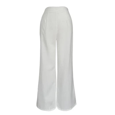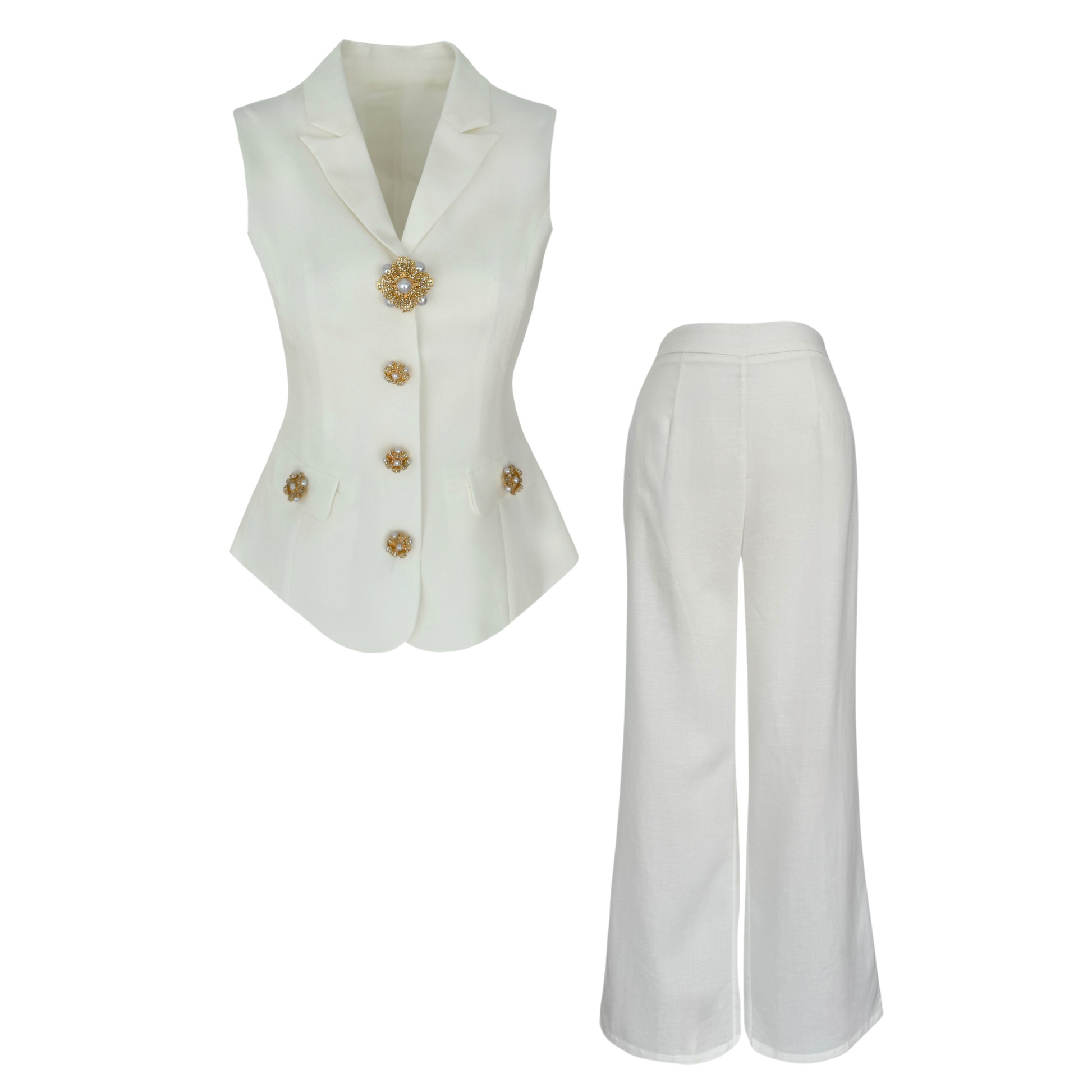 Paired with wide-leg trousers that elongate the frame and deliver graceful movement, this set blends structured sophistication with standout detail — perfect for elevated daywear or chic evening occasions.