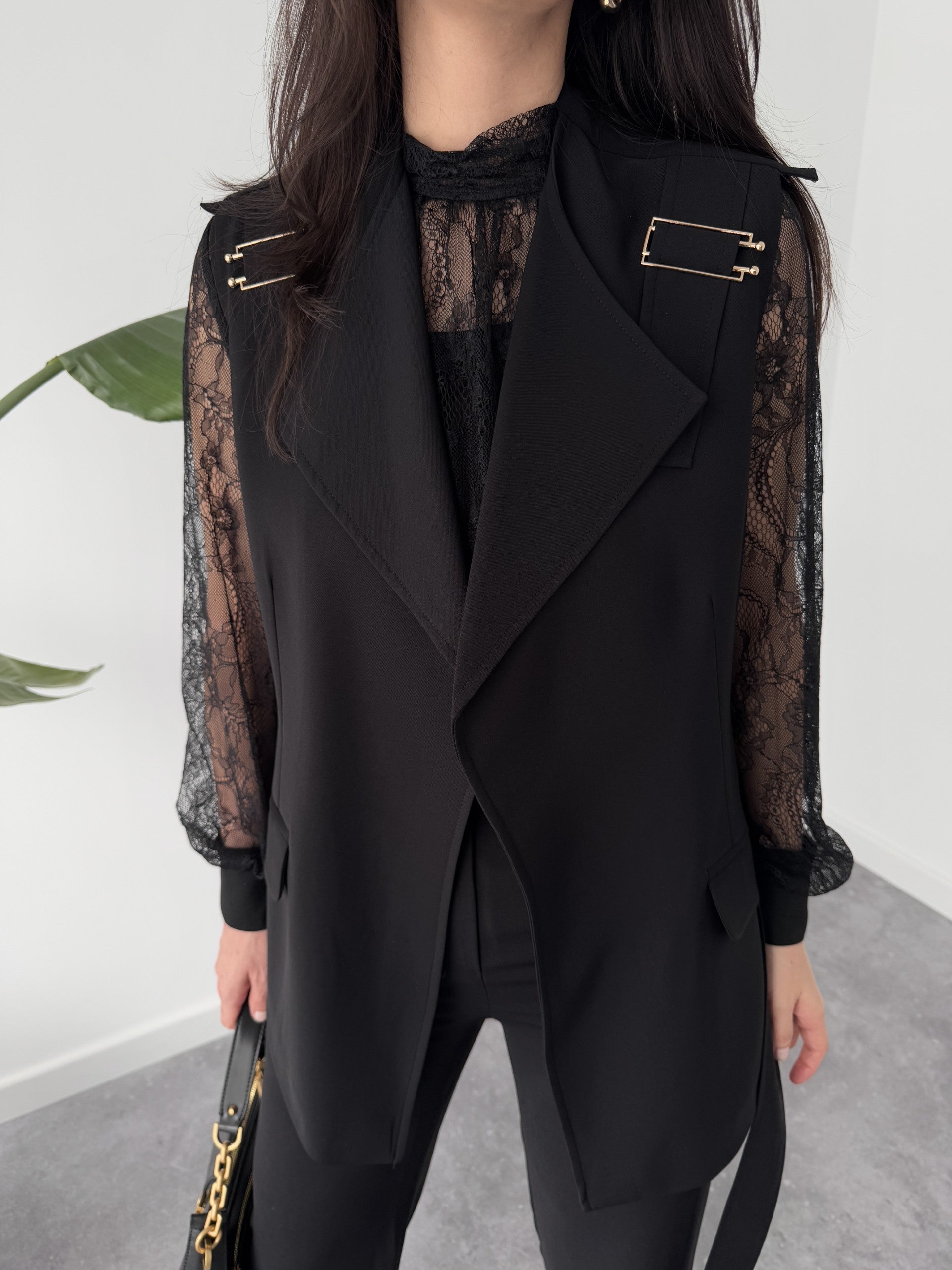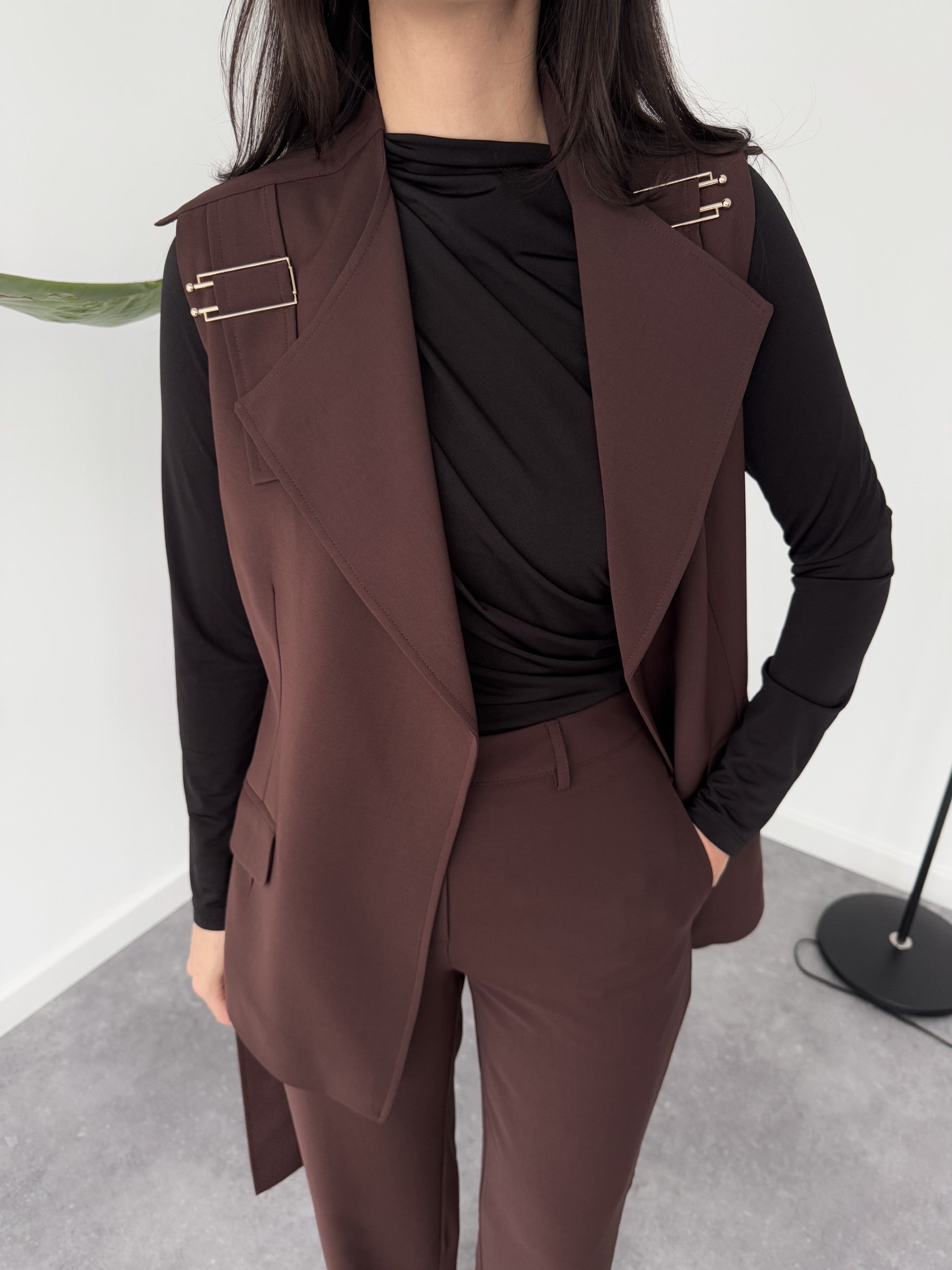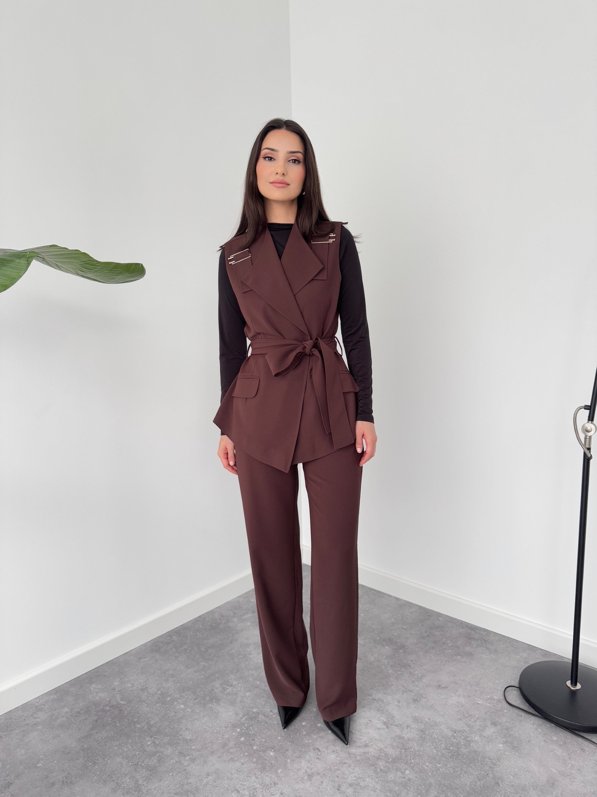 Make a statement in the Milena Belted Utility Set — where structured style meets everyday comfort. This two-piece ensemble features a tailored vest with wide lapels, utility-inspired flap pockets, and a waist-defining tie belt for a modern twist on classic suiting. Paired with straight-leg trousers, the look is sleek yet relaxed. Crafted from banana crepe, the fabric offers a soft touch and comfortable structure that keeps its shape all day without feeling airy or flimsy. Whether worn for work or a polished day out, MILENA is the set that does it all — effortlessly.
