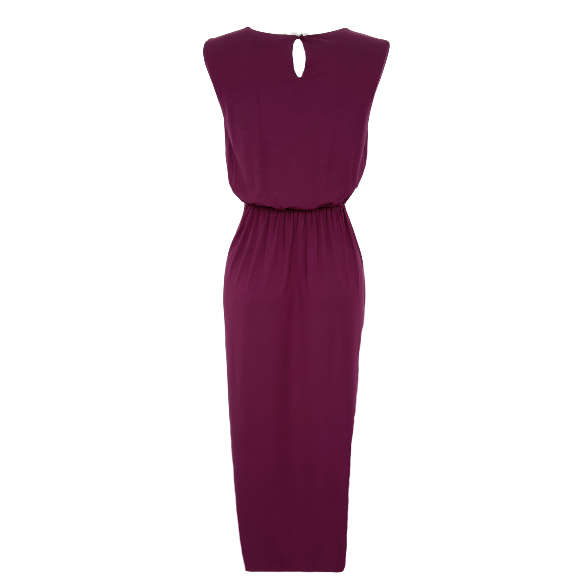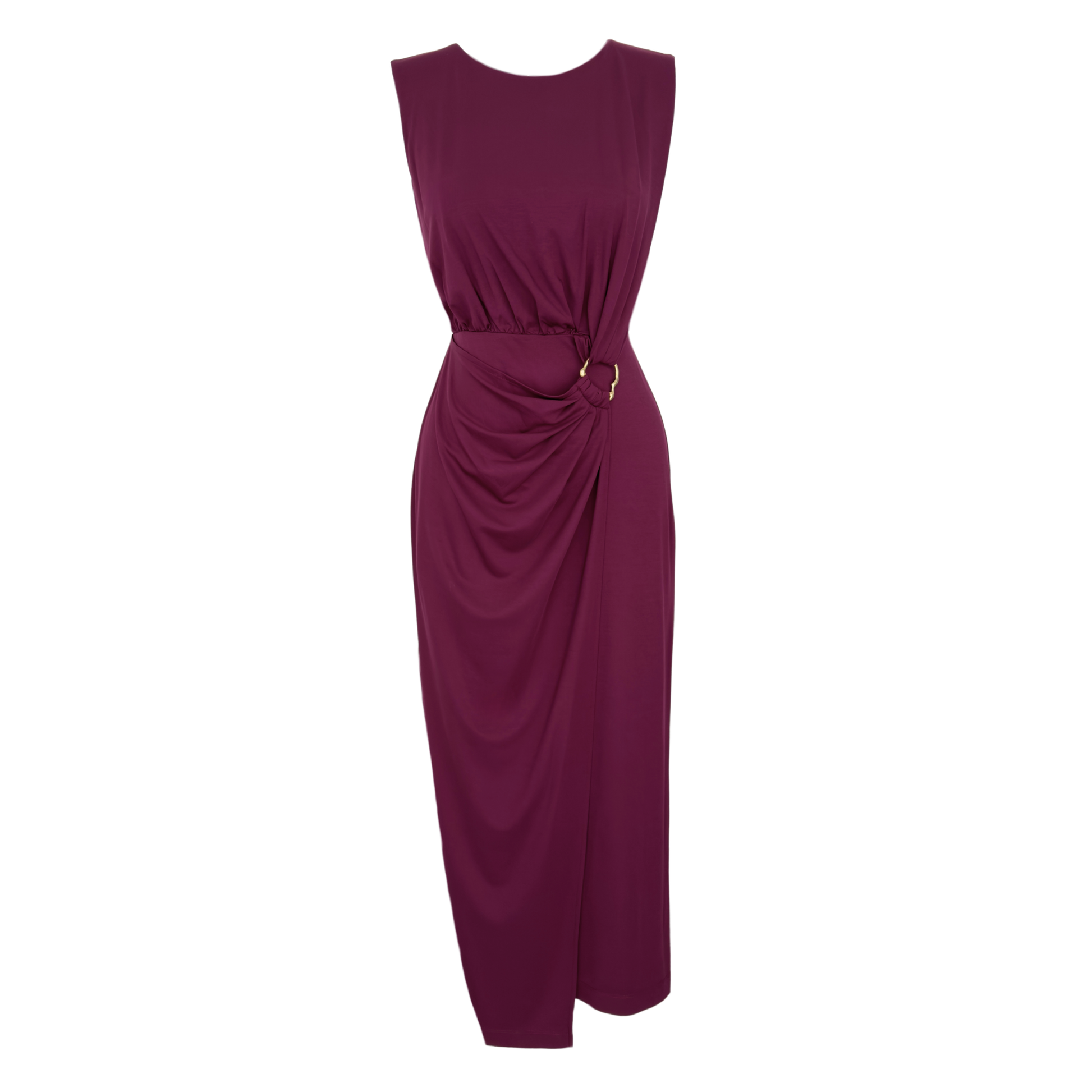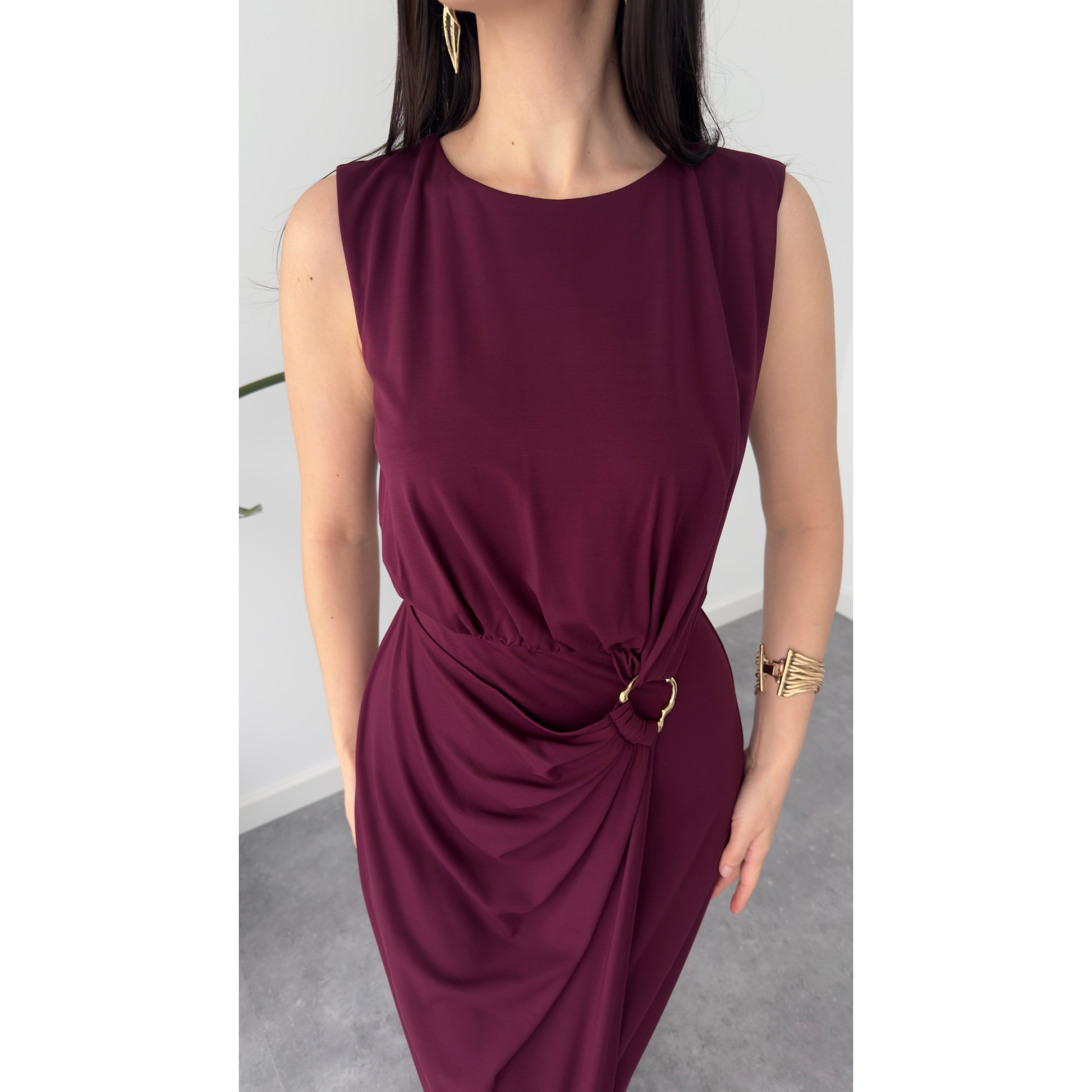 Slip into sophistication with the Muse Draped Midi Dress – a deep, wine-toned beauty that merges classic charm with modern allure. Featuring a soft round neckline, sleeveless cut, and statement gold ring accent at the waist, this dress is designed to flatter your curves while keeping it timeless.