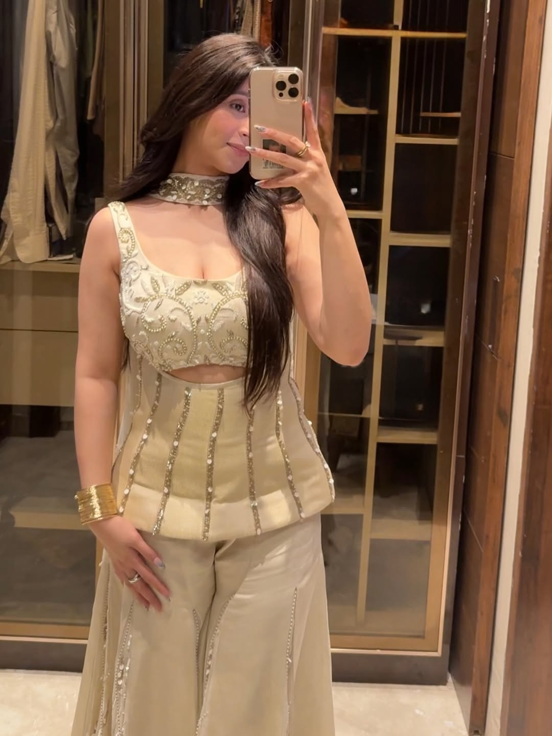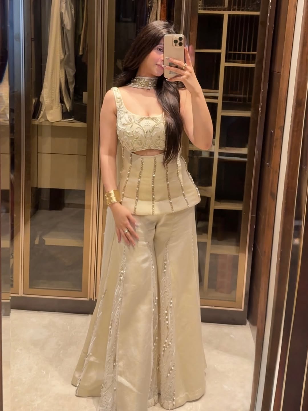 This stunning ensemble features a structured peplum-style top adorned with delicate embroidery and sequin detailing, paired with flared, embellished pants for a graceful, modern silhouette. The soft ivory hue exudes understated luxury, making it perfect for festive occasions, receptions, and elegant soirées.