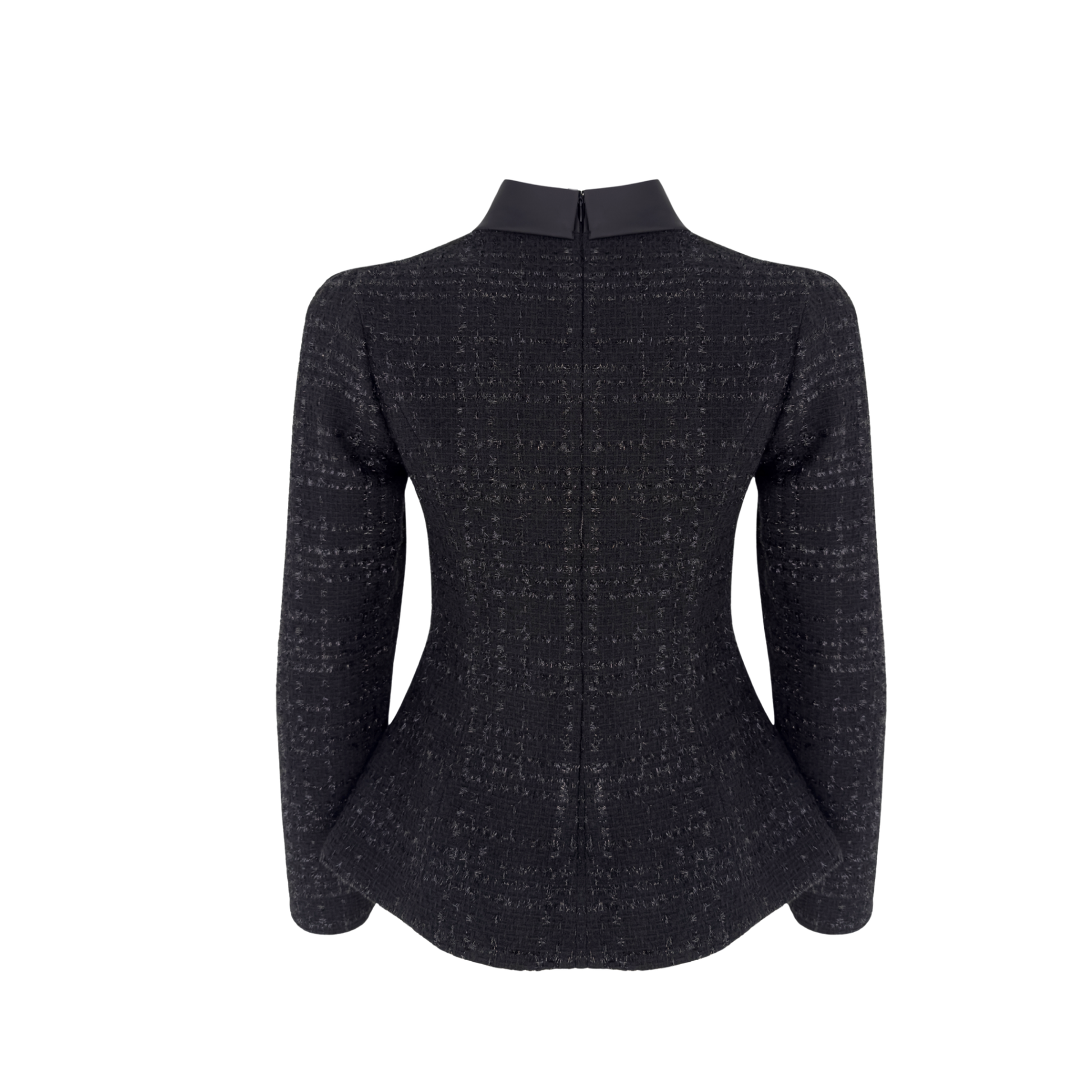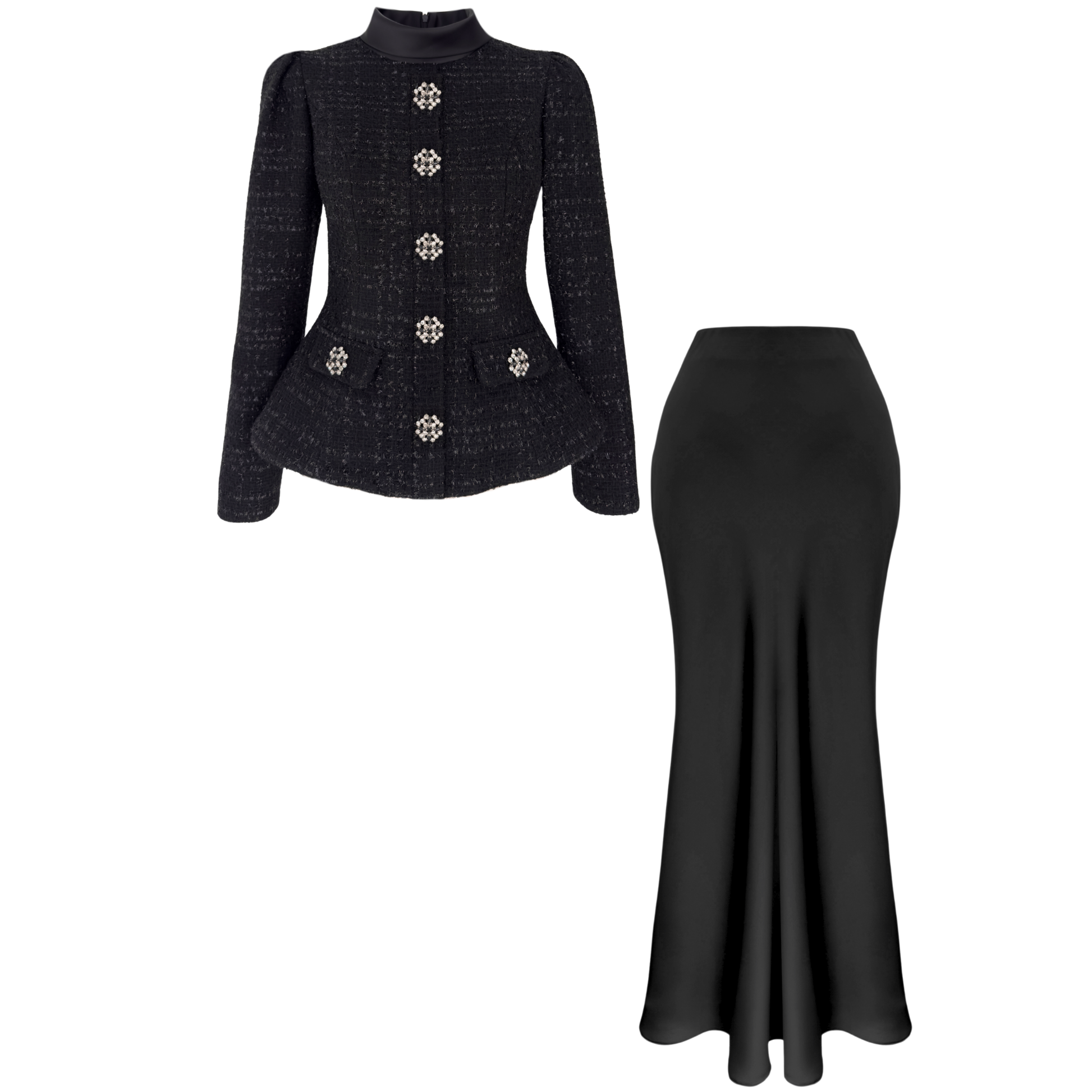 An elegant two-piece ensemble featuring a structured jacket with ornate jeweled buttons and a gracefully flowing mermaid-style skirt. The jacket’s tailored fit and intricate detailing create a sophisticated silhouette, while the sleek skirt adds a refined finish. Perfect for evening occasions, formal gatherings, or festive events, this set embodies timeless grace and modern elegance.
