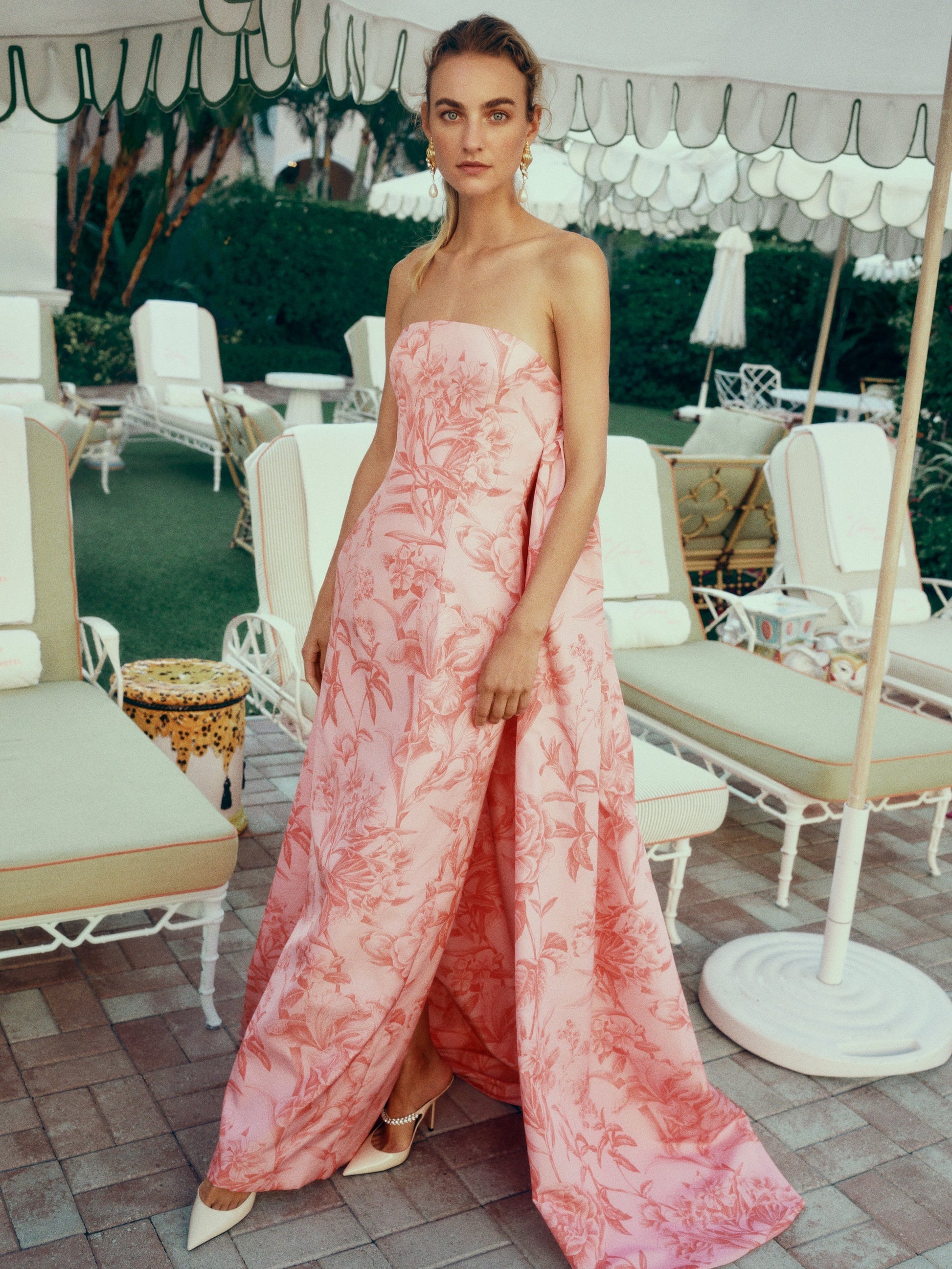 Radiating modern romance, the Tropical Rose Column Dress is a statement in sculptural beauty. This strapless silhouette flows seamlessly from a fitted bodice into a dramatic column shape, finished with a voluminous back overlay that trails into a soft train. The vibrant floral pattern in coral tones evokes tropical elegance, making it the perfect choice for destination weddings, red carpet moments, or grand celebrations. Designed to turn heads with grace and confidence.